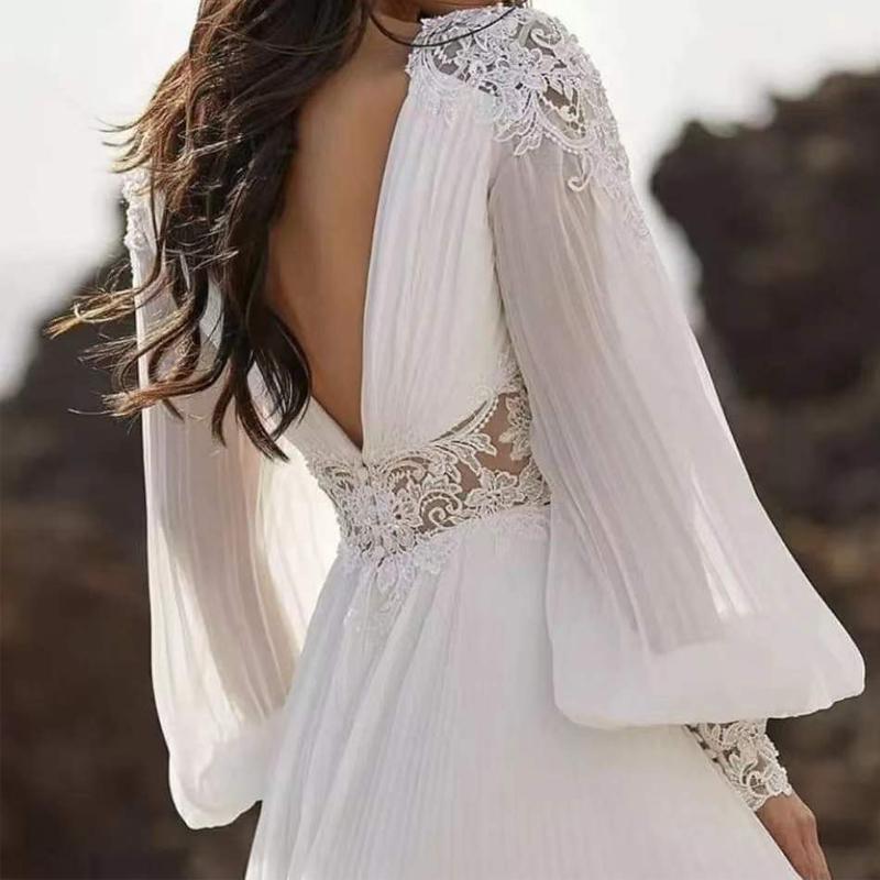Bohemian Chiffon A Line Wedding Dresses Puffy Sleeve Beach Bridal Gowns