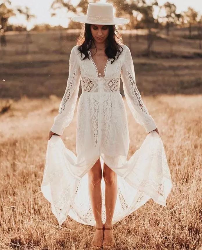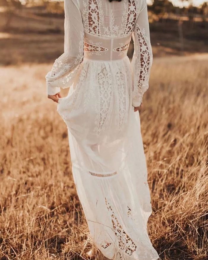 Bohemian Hippie Long Sleeve Wedding Dresses Crochet Lace V-neck Full Length Countryside Wedding Gown