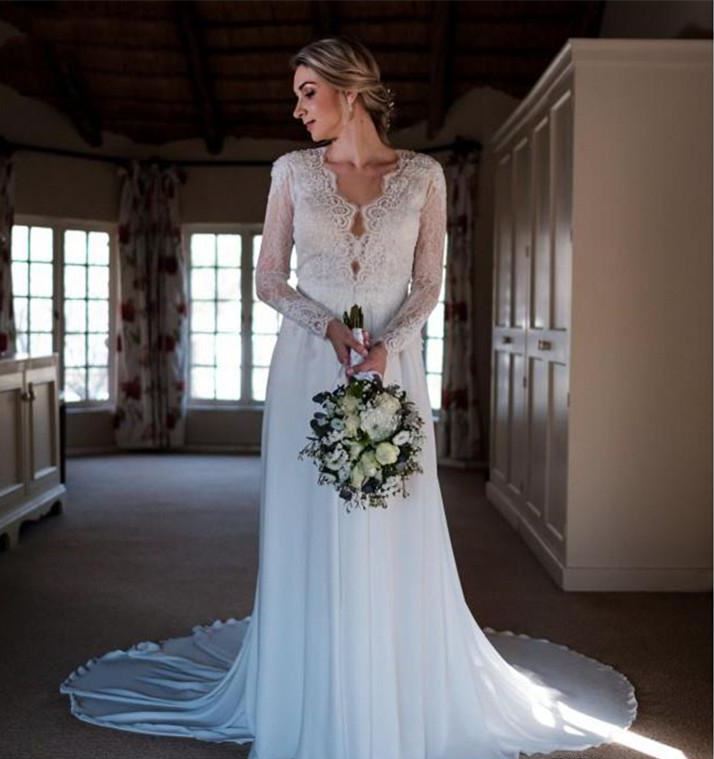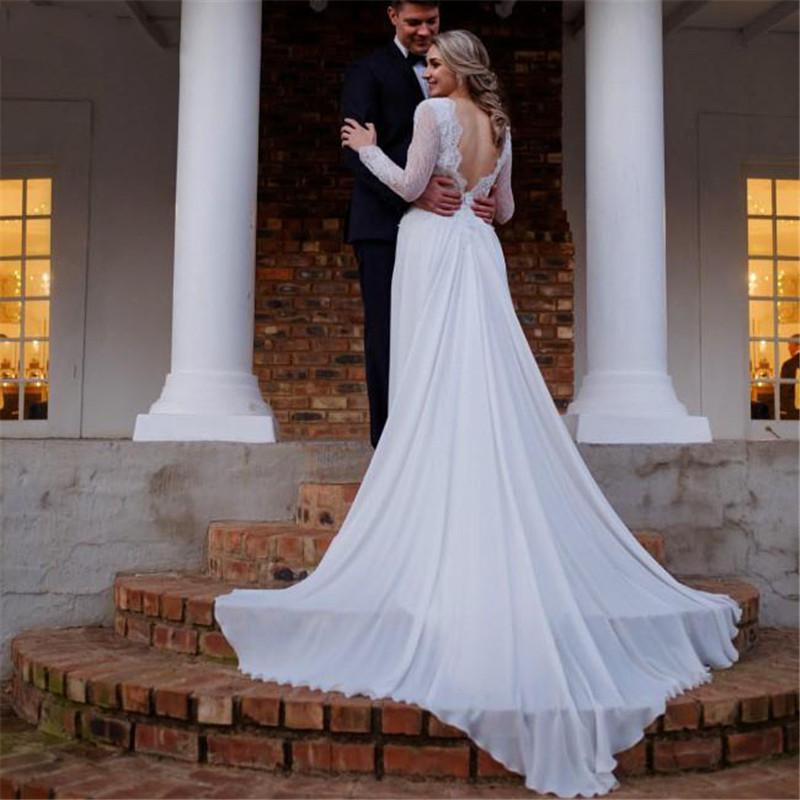 Boho Wedding Dresses Lace Chiffon Long Sleeve Deep Back V Neck Beach Bohemian Wedding Elegant Bridal Gowns