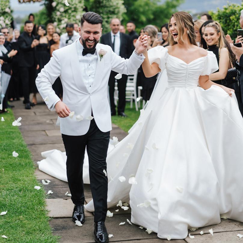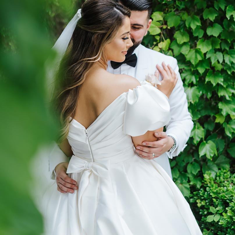 Off Shoulder Ball Gown Wedding Dresses for Women Short Sleeves Court Train Satin Plus Size Bridal Gowns