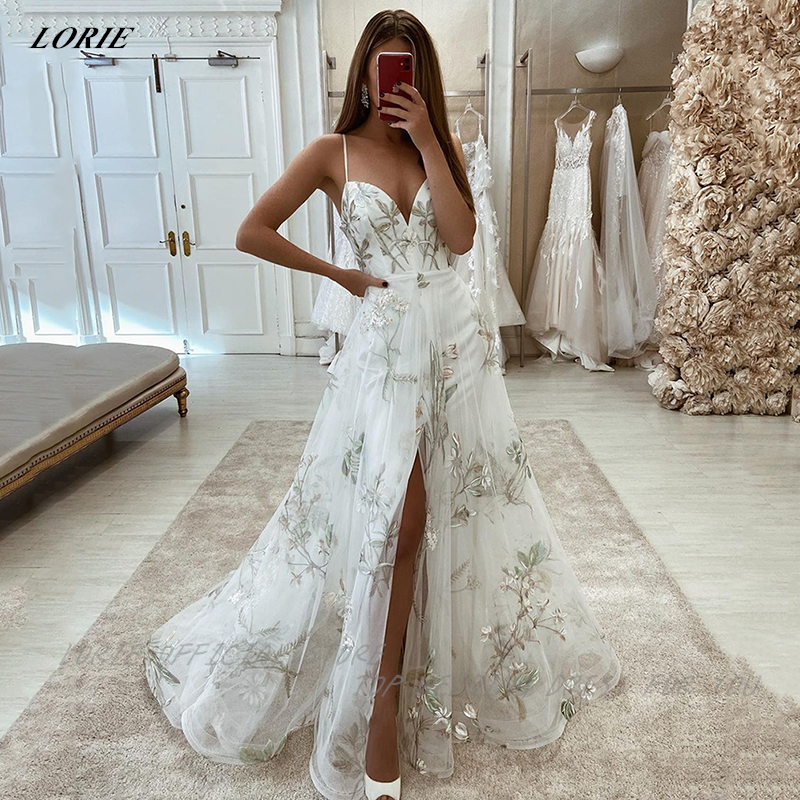 Lace Wedding Dresses Spaghetti Straps Sweetheart Side Slit Sexy A-Line Bridal Gowns