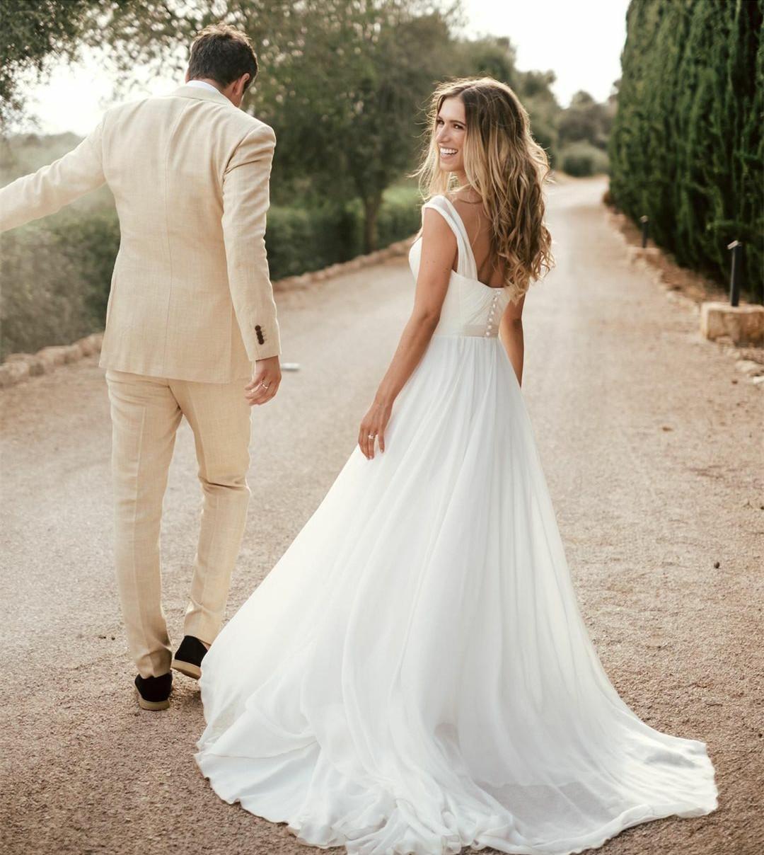 White Side Split Wedding Dresses Spaghetti Strap Bridal Gowns Chiffon A Line Garden Sweep Train