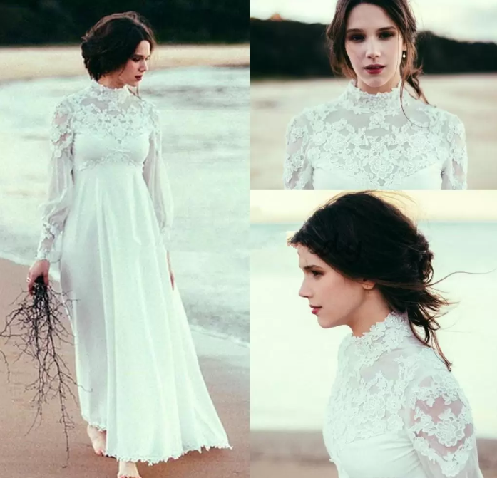 Boho High Neck Long Sleeves Wedding Dresses Lace Chiffon Empire Waist Ankle Length Beach Wedding Gown