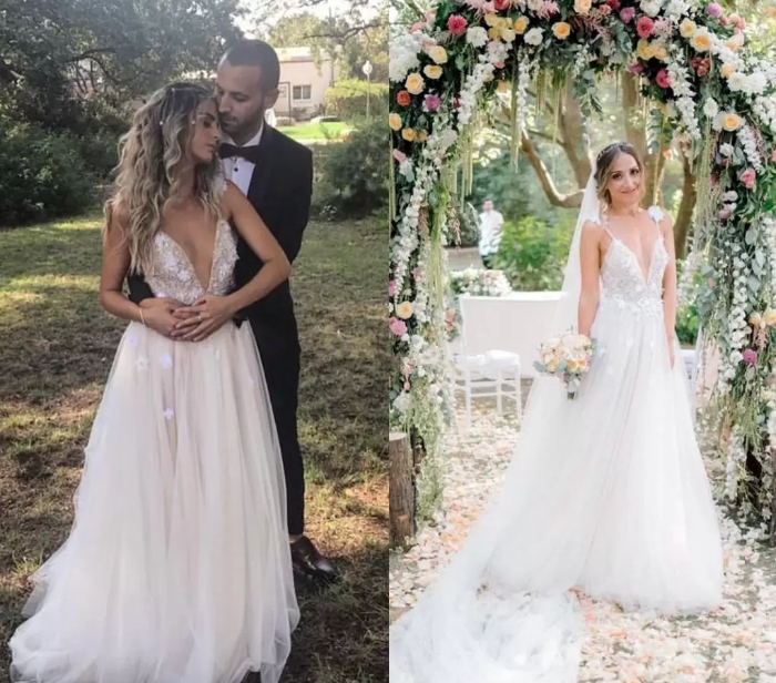 Boho Wedding Dresses V-neck Pearl Beading Tulle Floor Length Backless Sexy Beach Wedding Dresses Bohemian Bridal Gowns