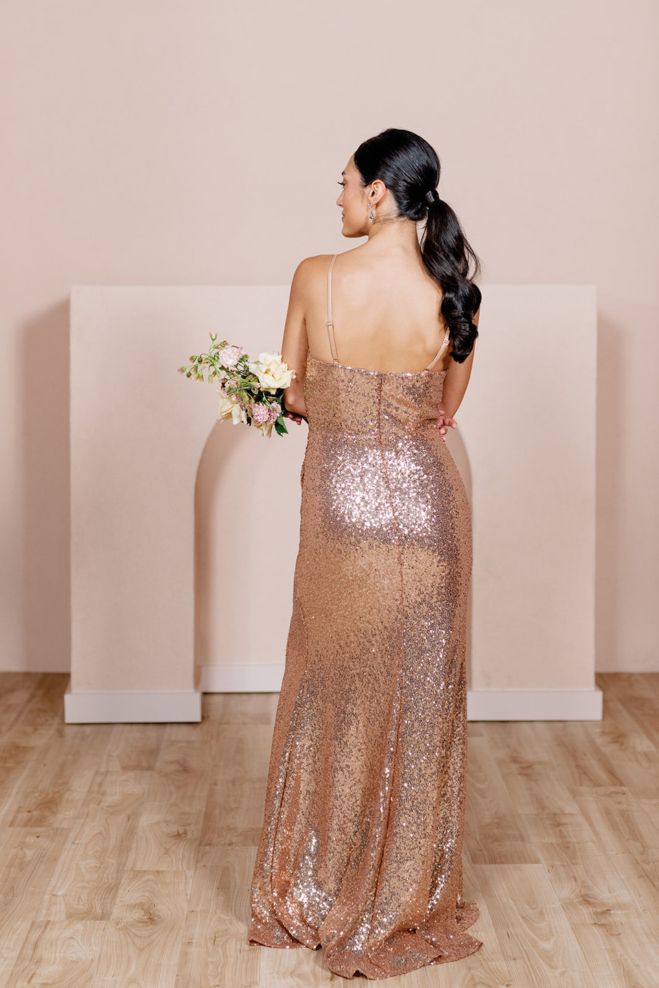Sheath Spaghetti V Neck Rose Gold Sequins Party Gowns
