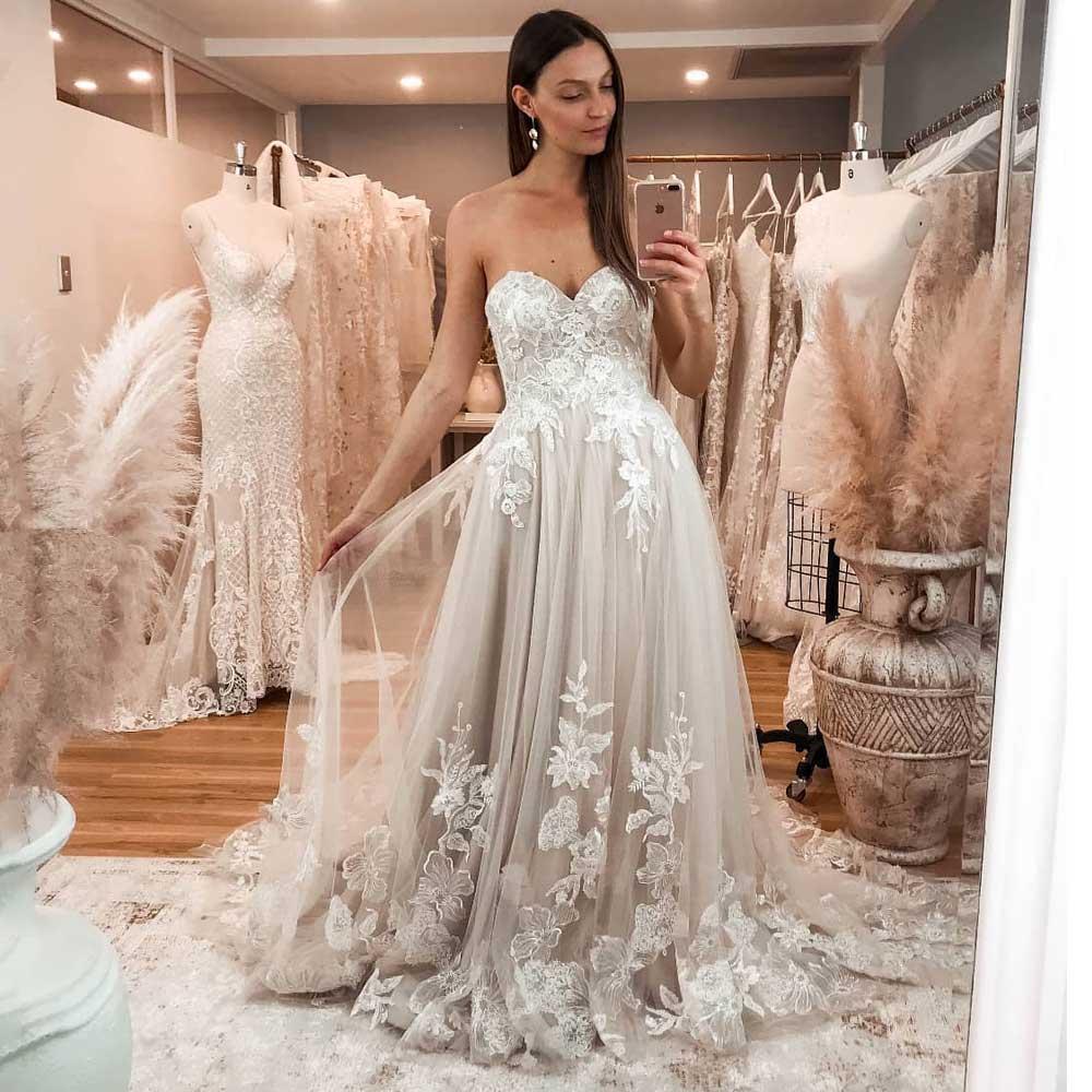 Stunning Lace Beach Wedding Dresses Sweetheart Neck Bohemian Bridal Gowns A Line Sweep Train Appliqued Tulle Wedding Dress