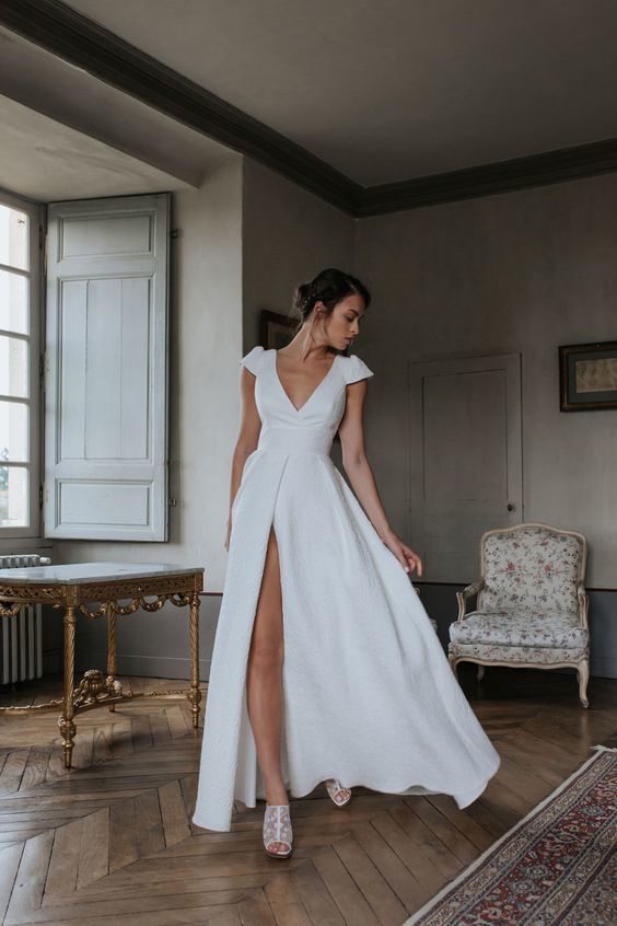 Vintage A-Line V Neck Cap Sleeve Cross Back Satin Wedding Dress