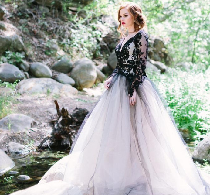 White Black Long Sleeves Lace Boho Wedding Dresses V Neck Sheer Tulle Applique Backless Country Bridal Wedding Gowns