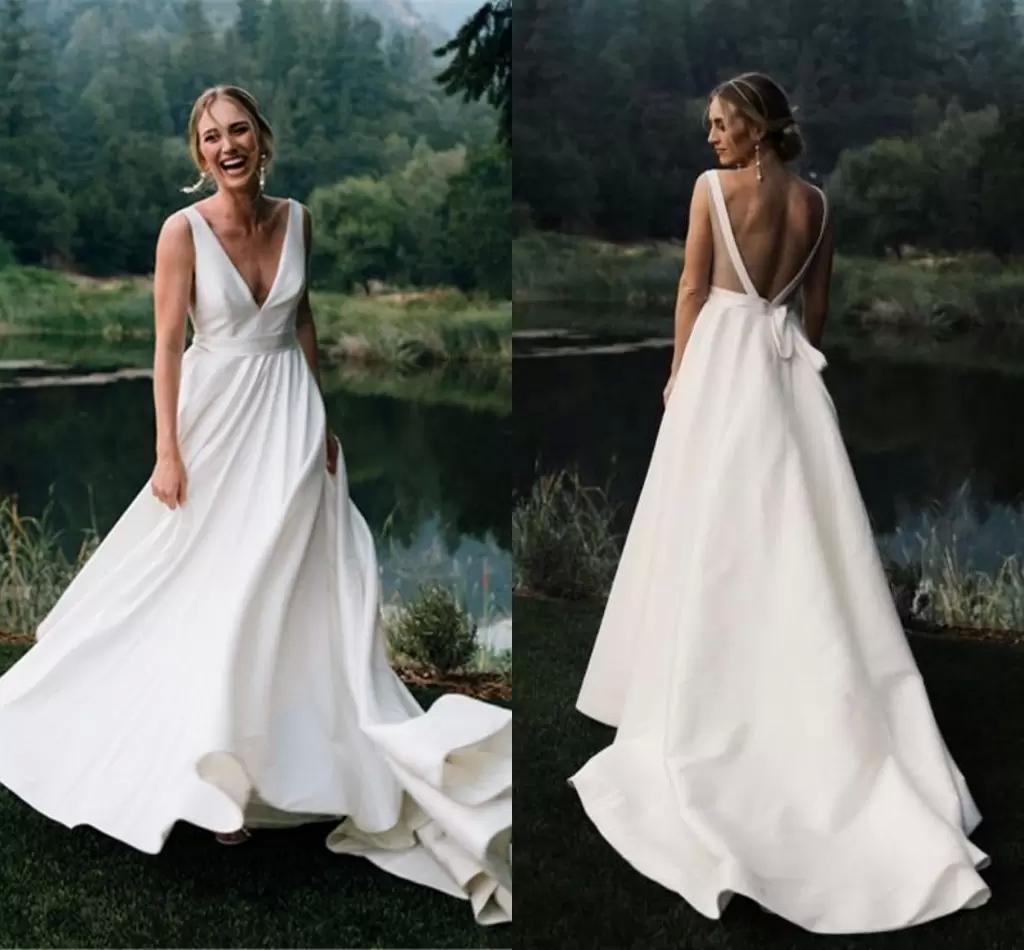 Elegant Satin Beach Wedding Dresses Bridal Gowns Deep V Neck Sexy Backless Sweep Train