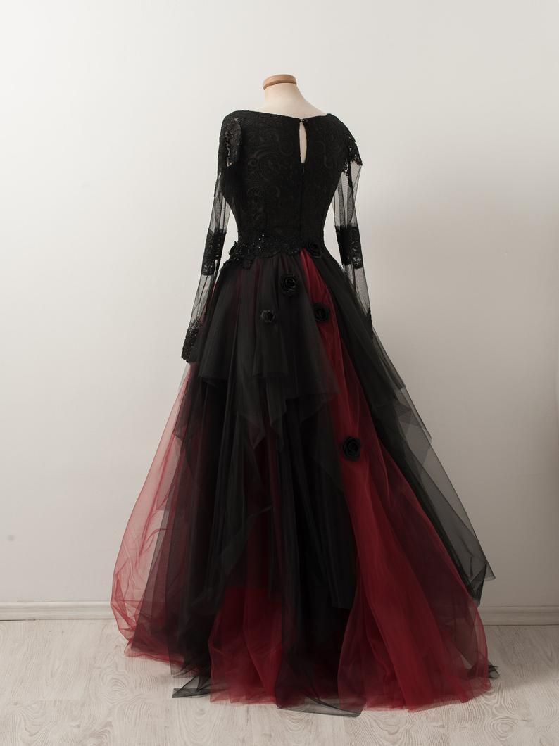 Black and Burgundy A-line Gothic Wedding Dresses Long Sleeves Low V Neck Sheer Sleeved Non White Vintage Bridal Gowns