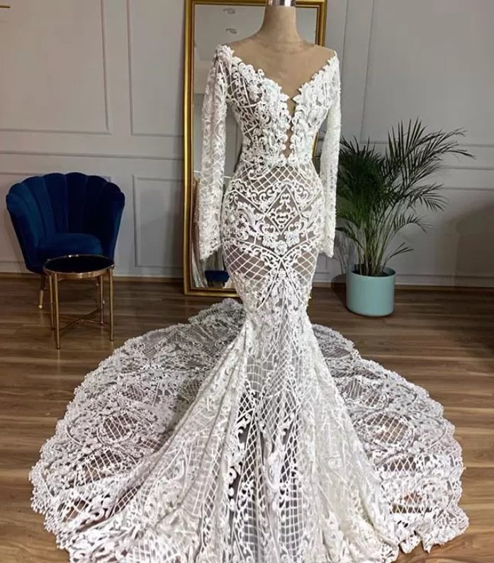 New White Lace Mermaid Wedding Dresses Long Sleeve Sweep Train Bohemian Beach Bridal Gowns