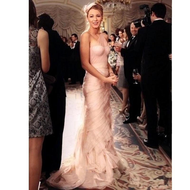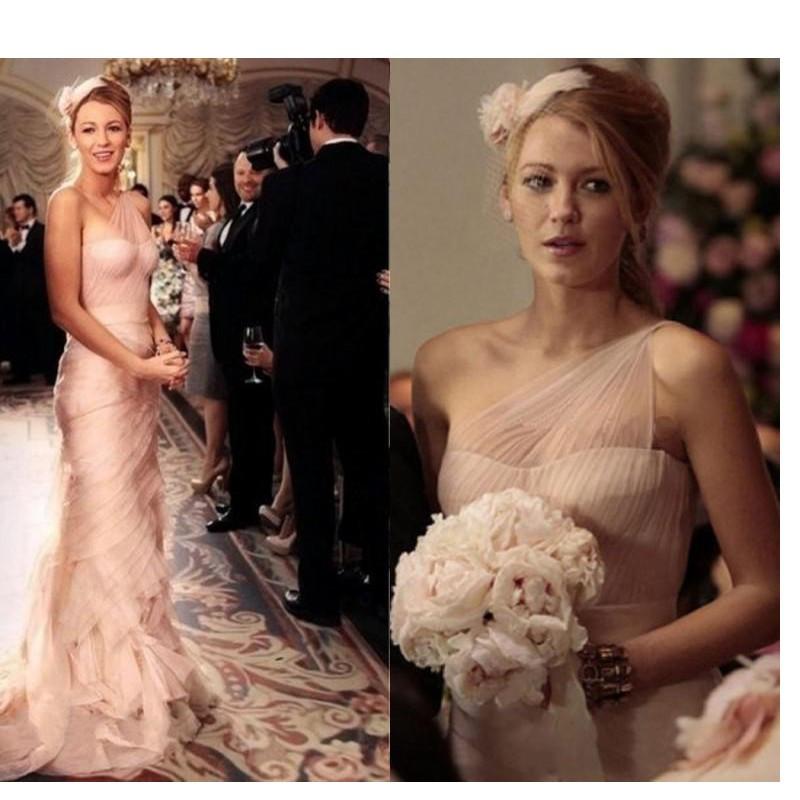 Gossip Girl Serena Sexy Blush Pink Mermaid Wedding Dresses One Shoulder Sweep Train Ruffles garden Bridal Gowns