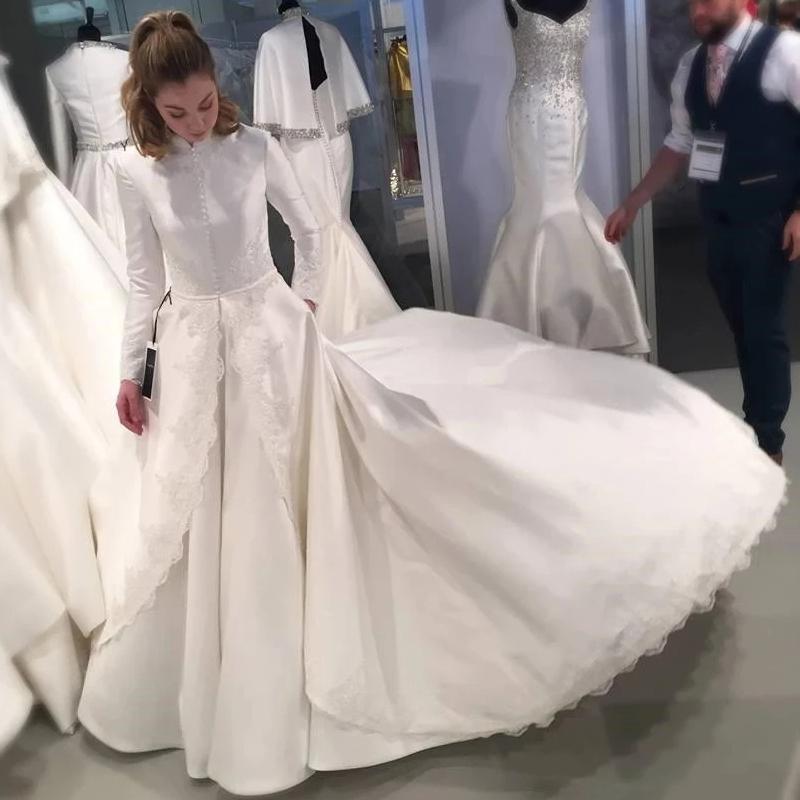 Vintage Satin Muslim Wedding Dress Hijab Church Arabic Bridal Gown