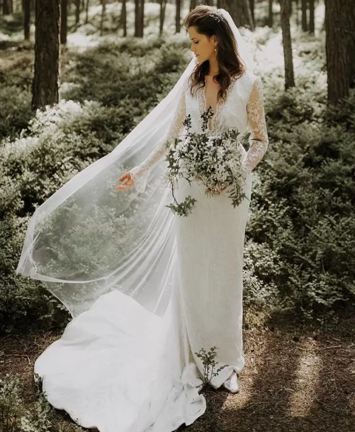 Elegant Country Style Lace Boho Long Illusion Sleeve Sheath Wedding Dresses Belt V-neck Floor Length Wedding Dress