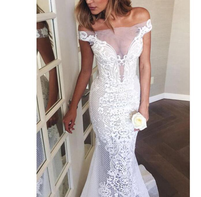 Mermaid Wedding Dresses Boho Bridal Gowns Off the Shoulder Sheer Neck Sexy Illusion Bodice Flower Pattern Appliques Lace