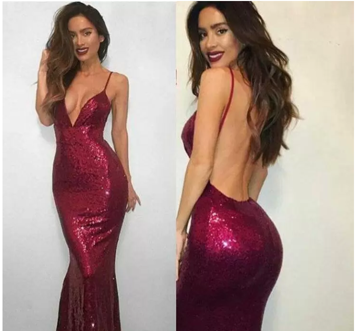 Burgundy Mermaid Sequined Prom Dresses Deep V-neck Straps Sexy Backless Formal Party Gowns