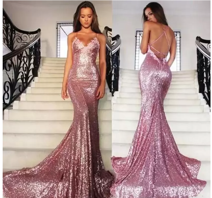 Rose Pink Glitz Sexy Mermaid Prom Dresses Spaghetti Strap Backless Sweep Train Formal Evening Dresses