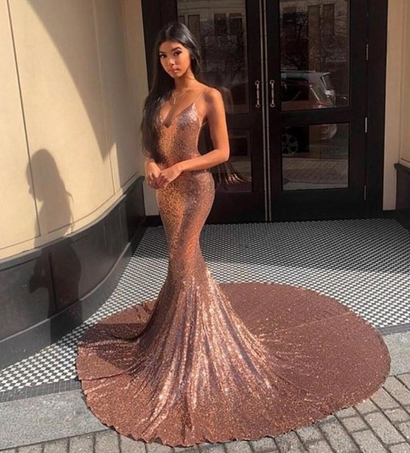 Sexy Spaghetti Straps Rose Gold Sequins Prom Dresses Mermaid Saudi Arabic Long Formal Evening Gown