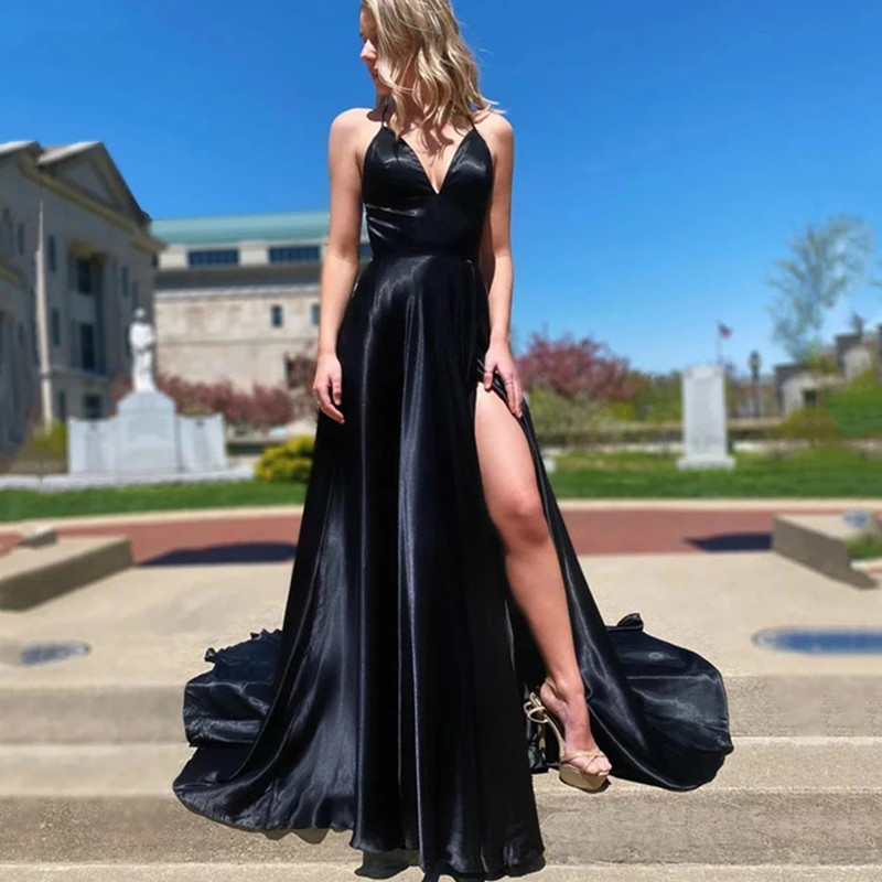 Spaghetti Straps Evening Dress Black Sexy V-Neck Long Prom Dress