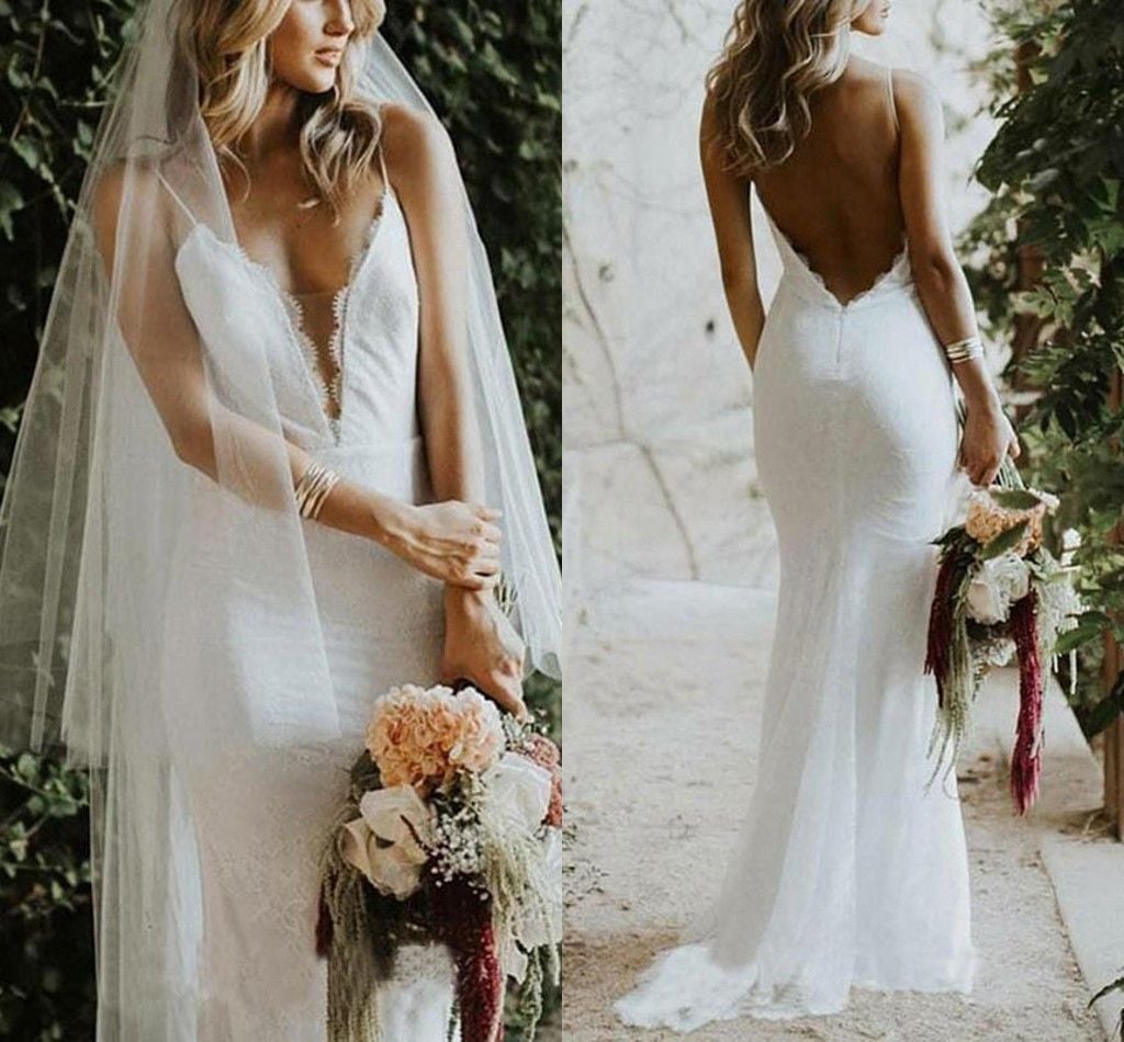 Elegant Sexy Lace Plus Size Sheath Wedding Dress Spaghetti Straps Deep V Neck Backless Court Train Applique Bridal Gown