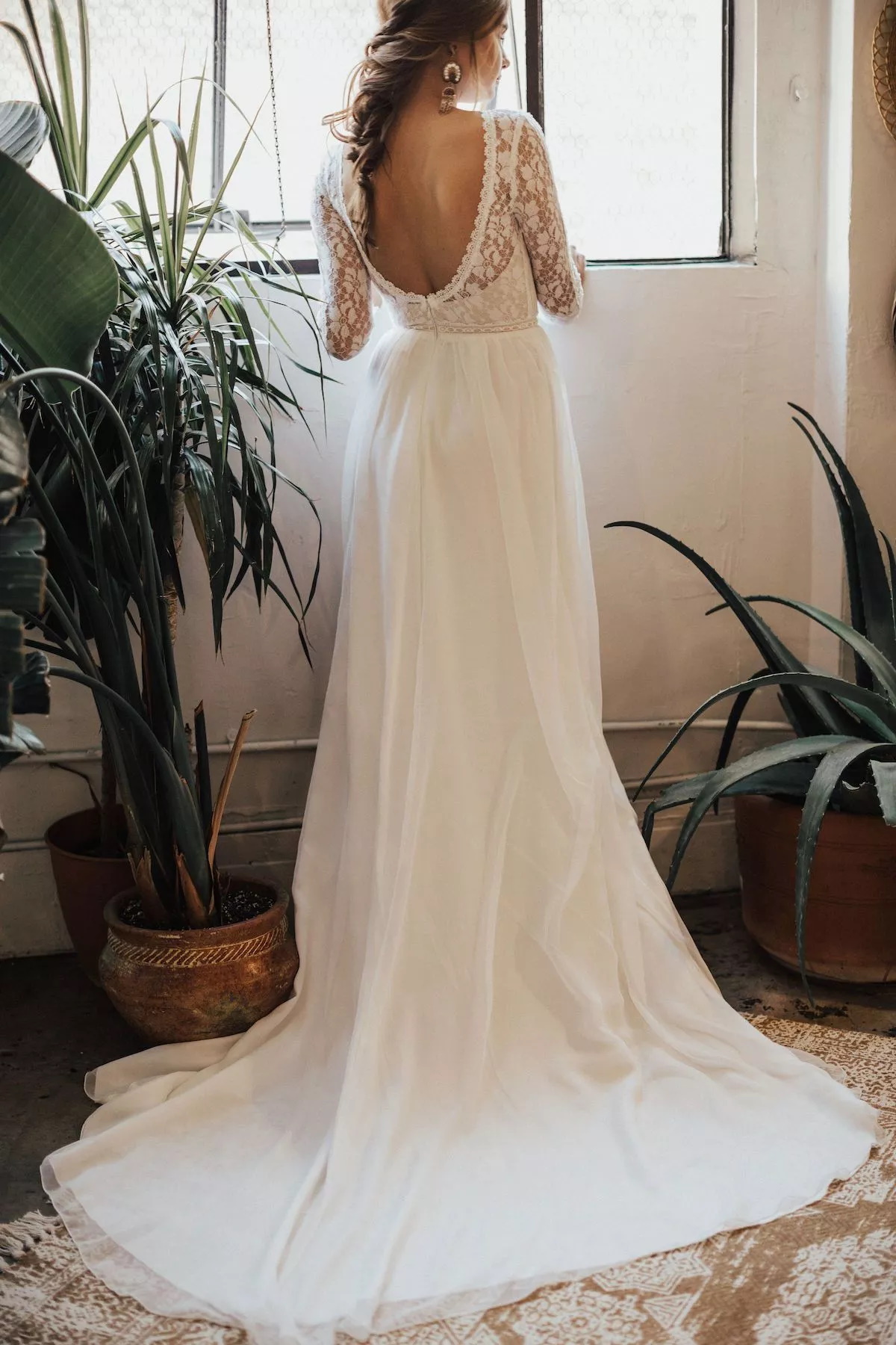 Romantic Bohemian Boat Neck Open Back Sweep Train Long Sleeve A-Line Lace Wedding Dress