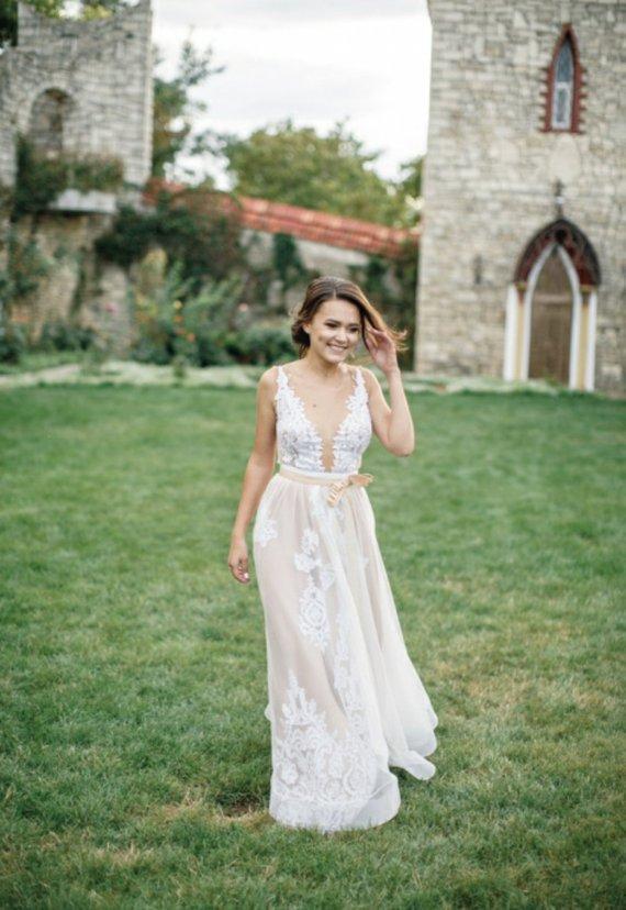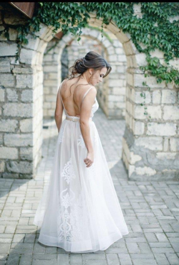 A line Lace Appliques Scoop Prom Dresses Backless Tulle Ivory Wedding Dresses