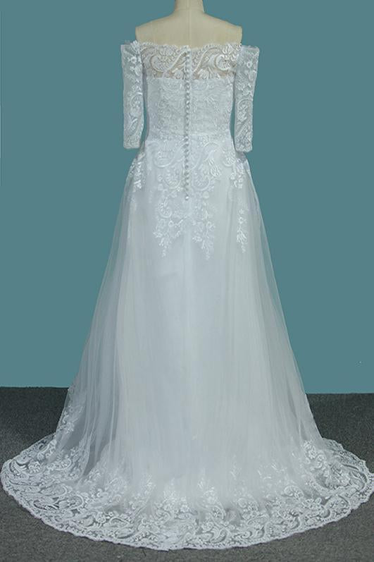 A Line White Off the Shoulder Half Sleeves Lace Appliques Tulle Wedding Dresses
