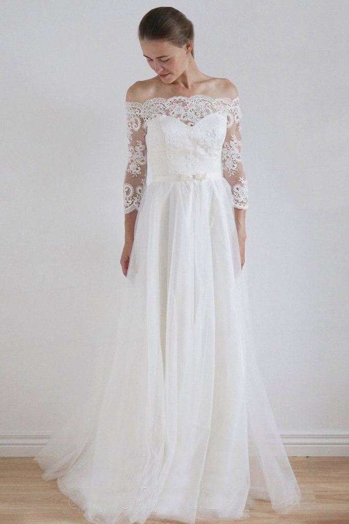 A-Line Lace Scoop 3/4 Sleeve Appliques Tulle Floor-Length White Button Wedding Dresses