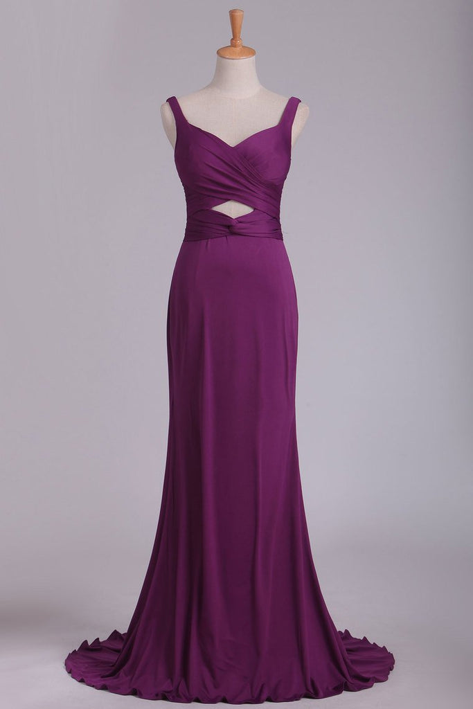 Grape Prom Dresses Straps Open Back Spandex With Ruffles Sweep Train