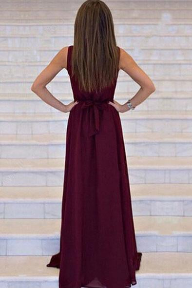 Simple A-line V-neck Chiffon Sweep Train Burgundy Sleeveless Sashes Prom Dresses