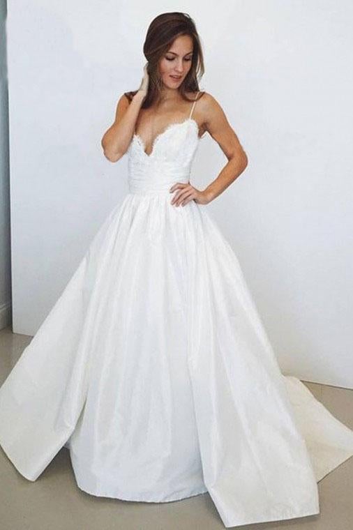 Charming A-Line Spaghetti Straps Ivory V-Neck Lace Sleeveless Wedding Dresses