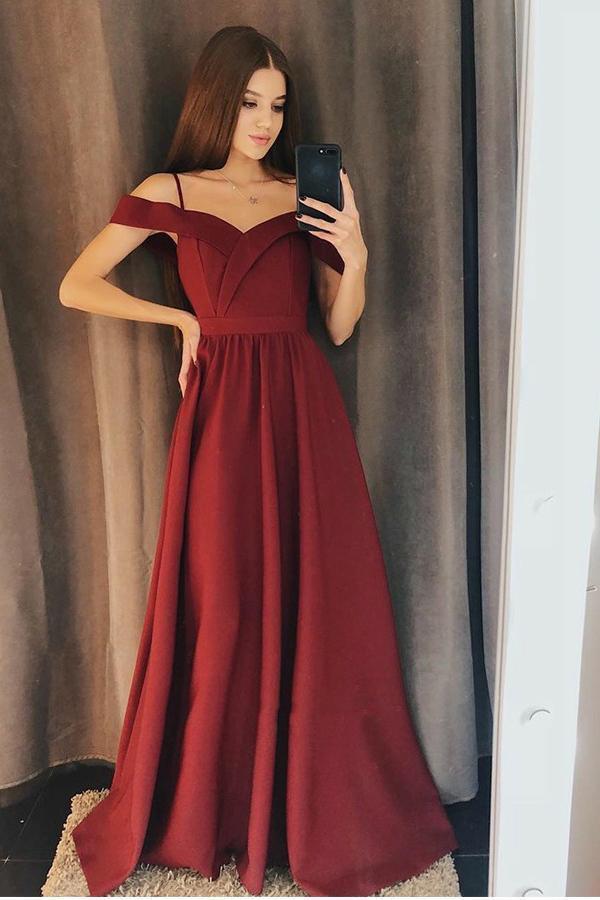 A line Burgundy Cold Shoulder Sweetheart Prom Dresses Satin Long Evening Dresses