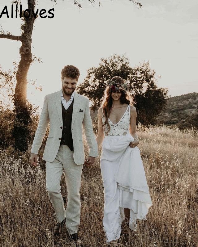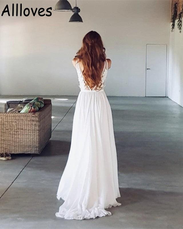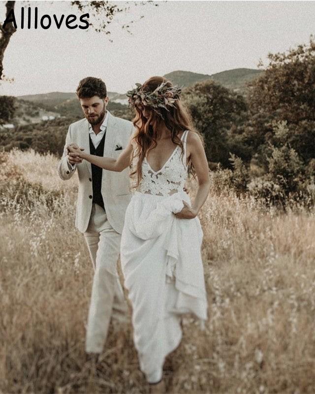 Sheer Straps Lace Appliqued Boho Country Wedding Gowns Sleeveless Sexy V Neck Simple Bridal Dresses