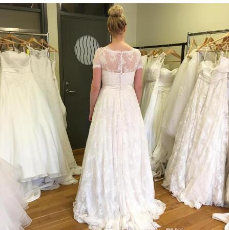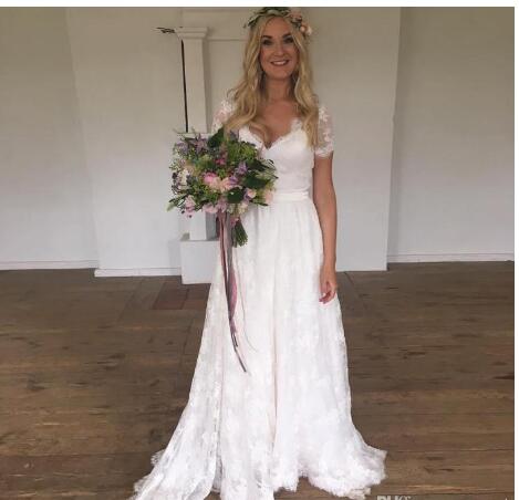 Lace Bohemian Summer Beach Wedding Dresses with Short Sleeve A-Line Sheer Buttons Back Bridal Gowns