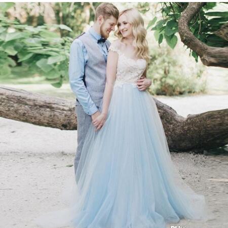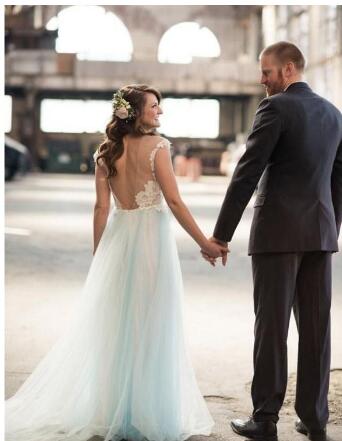 White Lace Blue Tulle Wedding Dresses Cap Sleeve Sheer Neck Bridal Gown