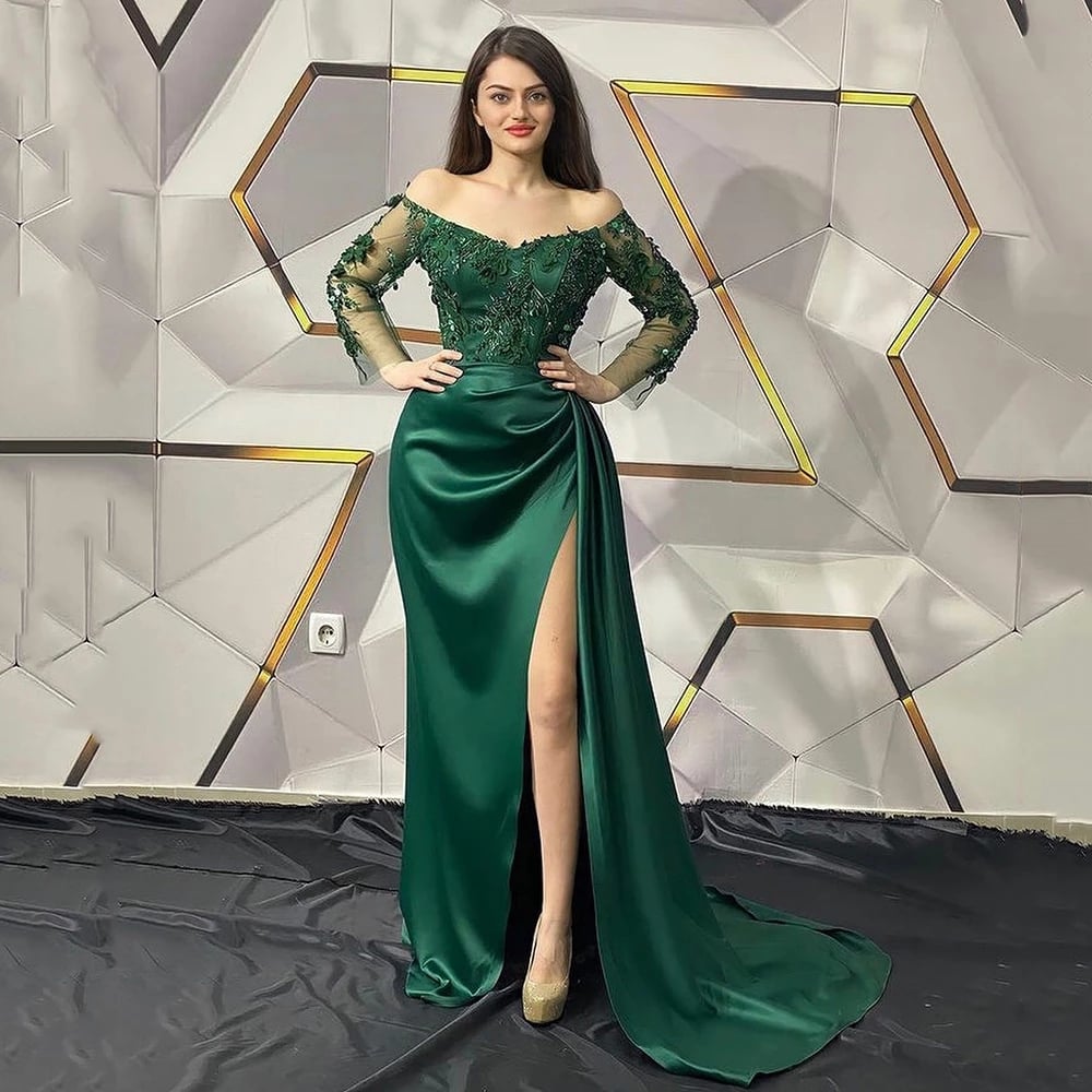 Emerald Green Lace Evening Dresses Off The Shoulder Beads Long Sleeves Split Front Satin Formal Women Prom Party Gowns