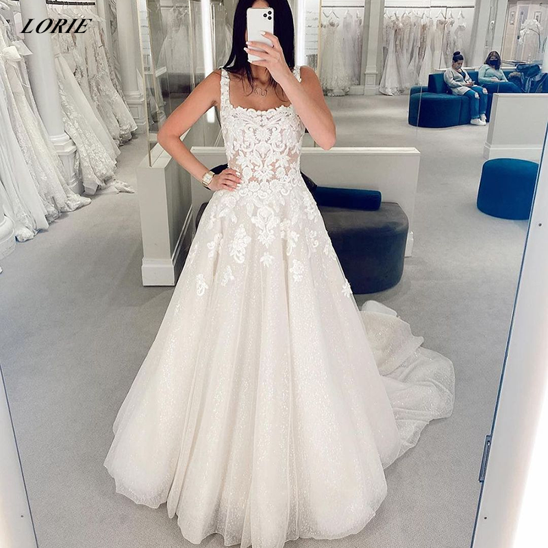 Glitter Lace Wedding Dresses Sleeveless Square Neck Appliques Bohemia Bridal Gowns