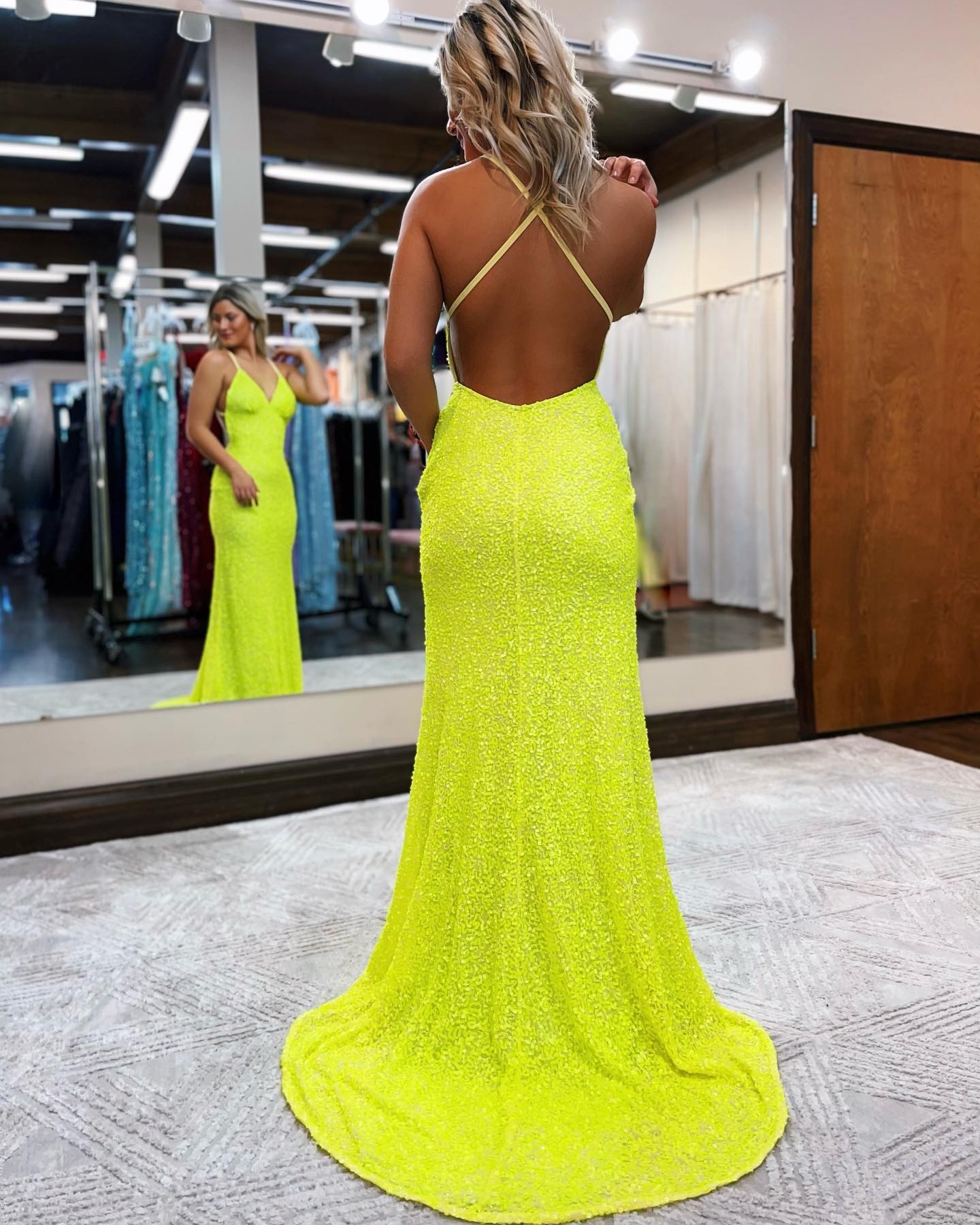 Sparkly Mermaid V Neck Yellow Sequins Long Prom Dress
