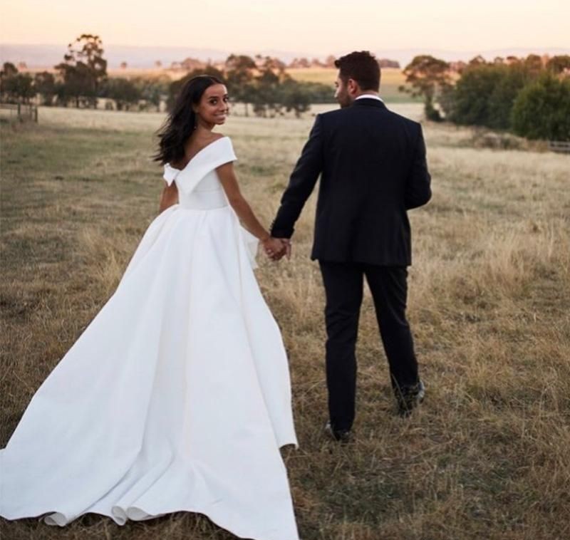 Boho Wedding Dresses Off the Shoulder Short Sleeves Side Slit Satin Ruched Pleats Sweep Train A Line Custom Made Bridal Gowns