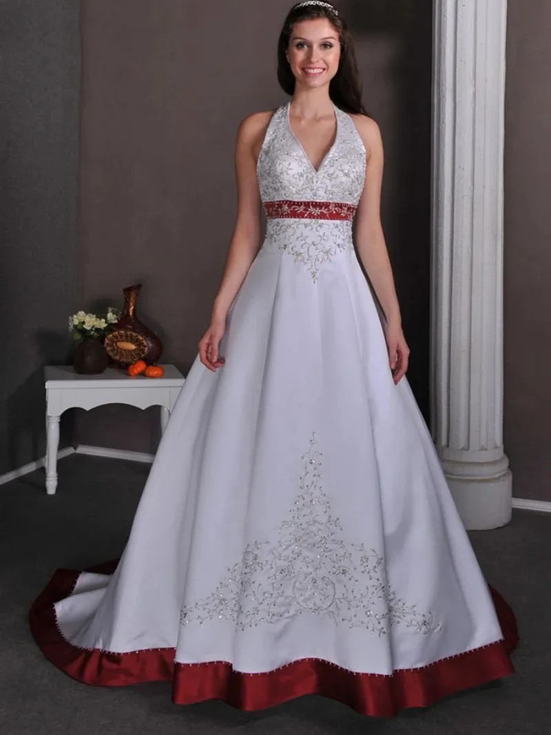 Elegant Embroidered Long A Line Wedding Dresses Halter Neck Backless Lace-Up White And Burgundy Bridal Gowns V-Neck Court Train Vintage Satin