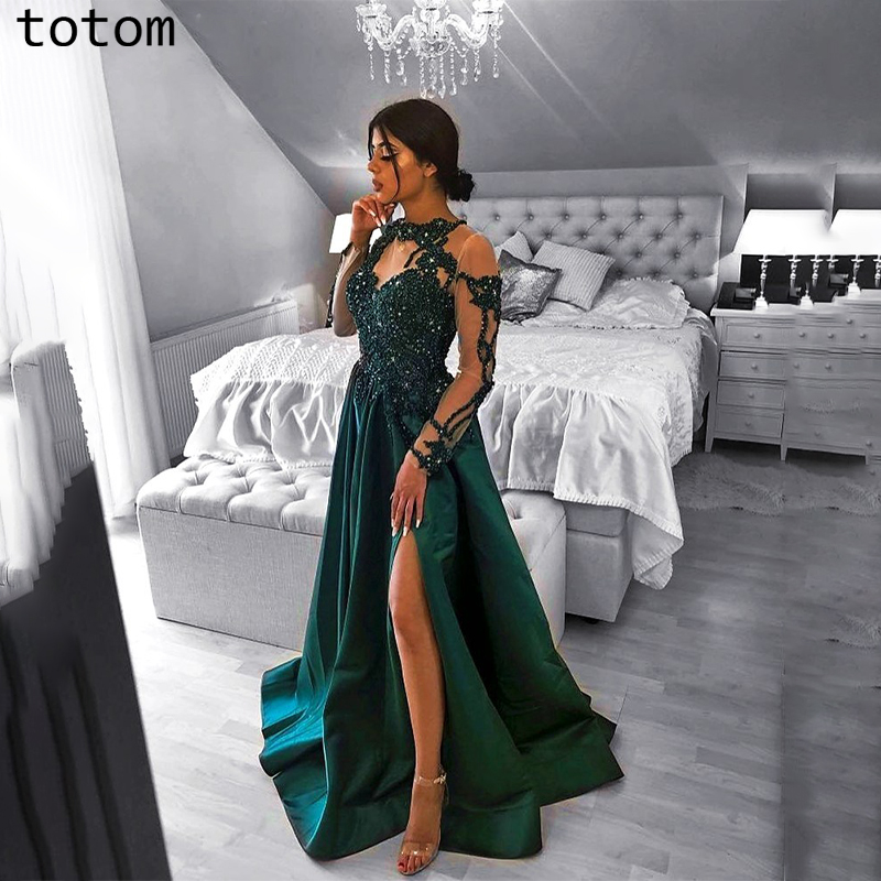 Emerald Green Evening Dress Long Sleeve A-Line Tail Skirt Ball Gown Satin Side Slit Sexy Formal Party Dress