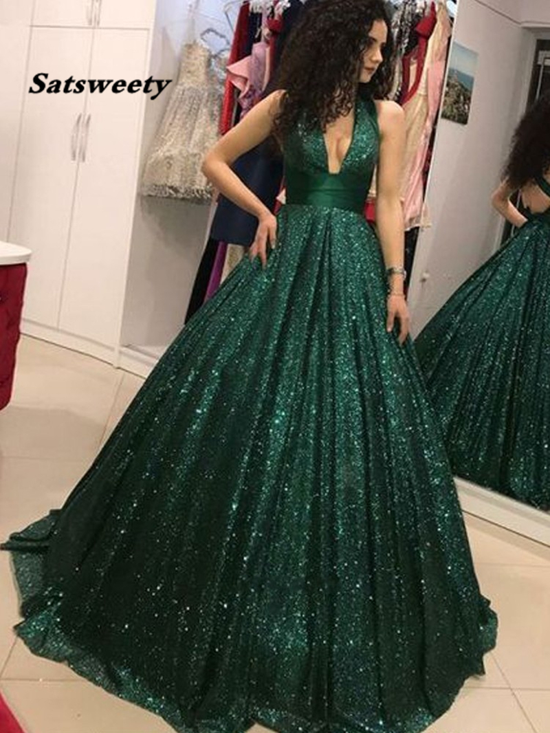 Emerald Green Prom Dresses V-Neck Glitter Sequin Ball Gown Backless Party Maxys Long Prom Gown Evening Dress