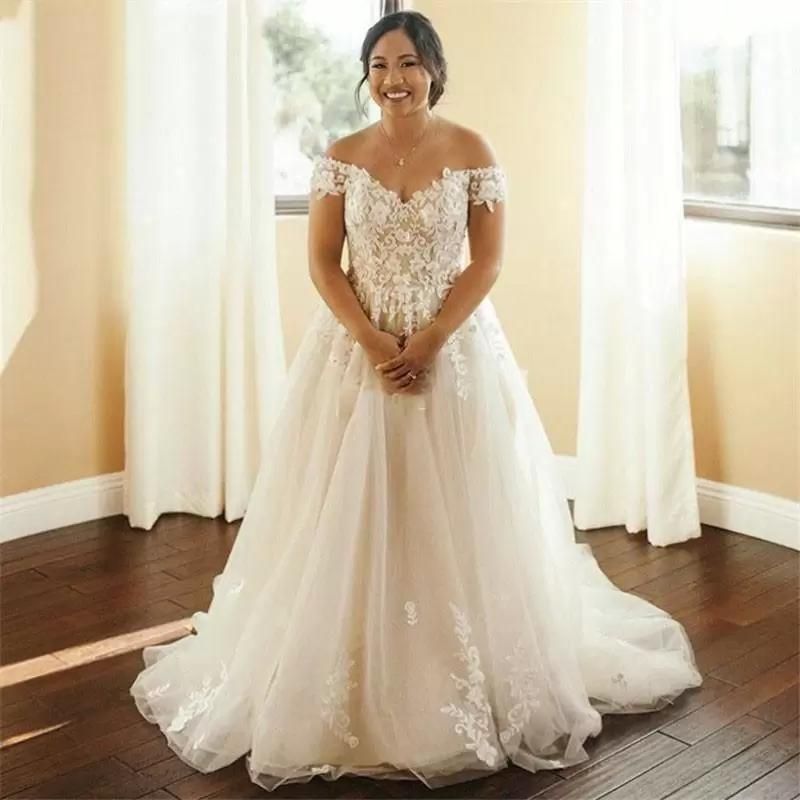 Gorgeous Wedding Dresses Off the Shoulder Lace Applique Straps Ruched Pleats Sweep Train A Line Beach Country Custom Made Bridal Gowns