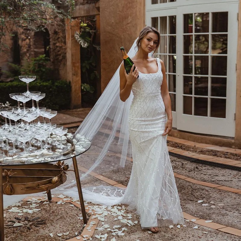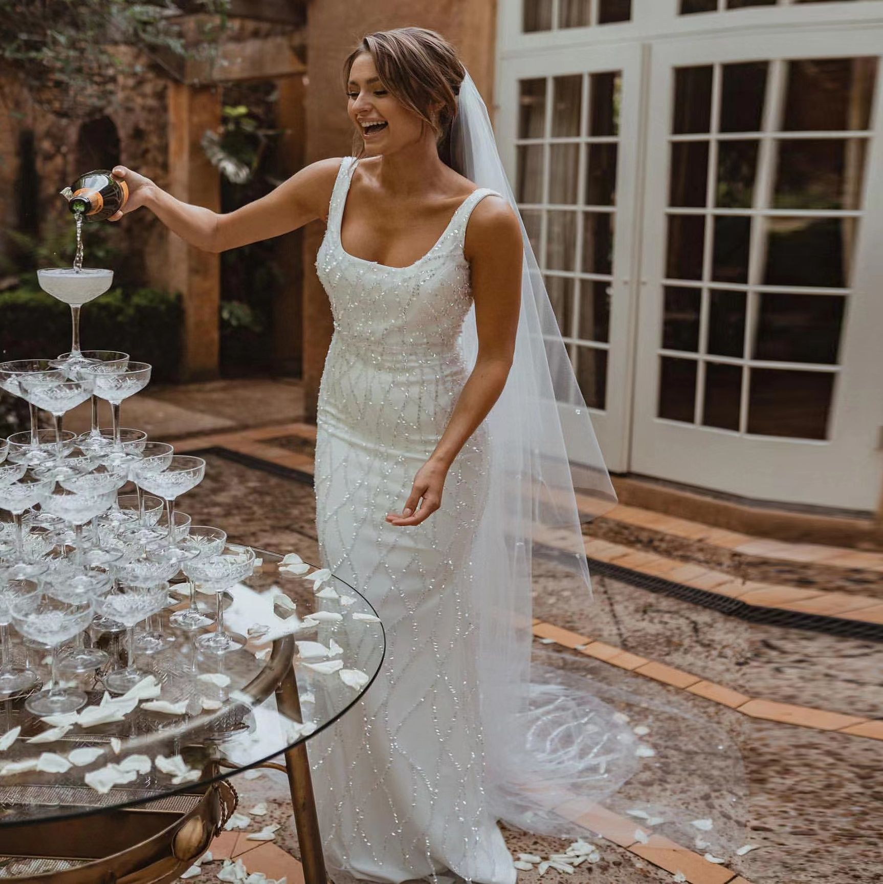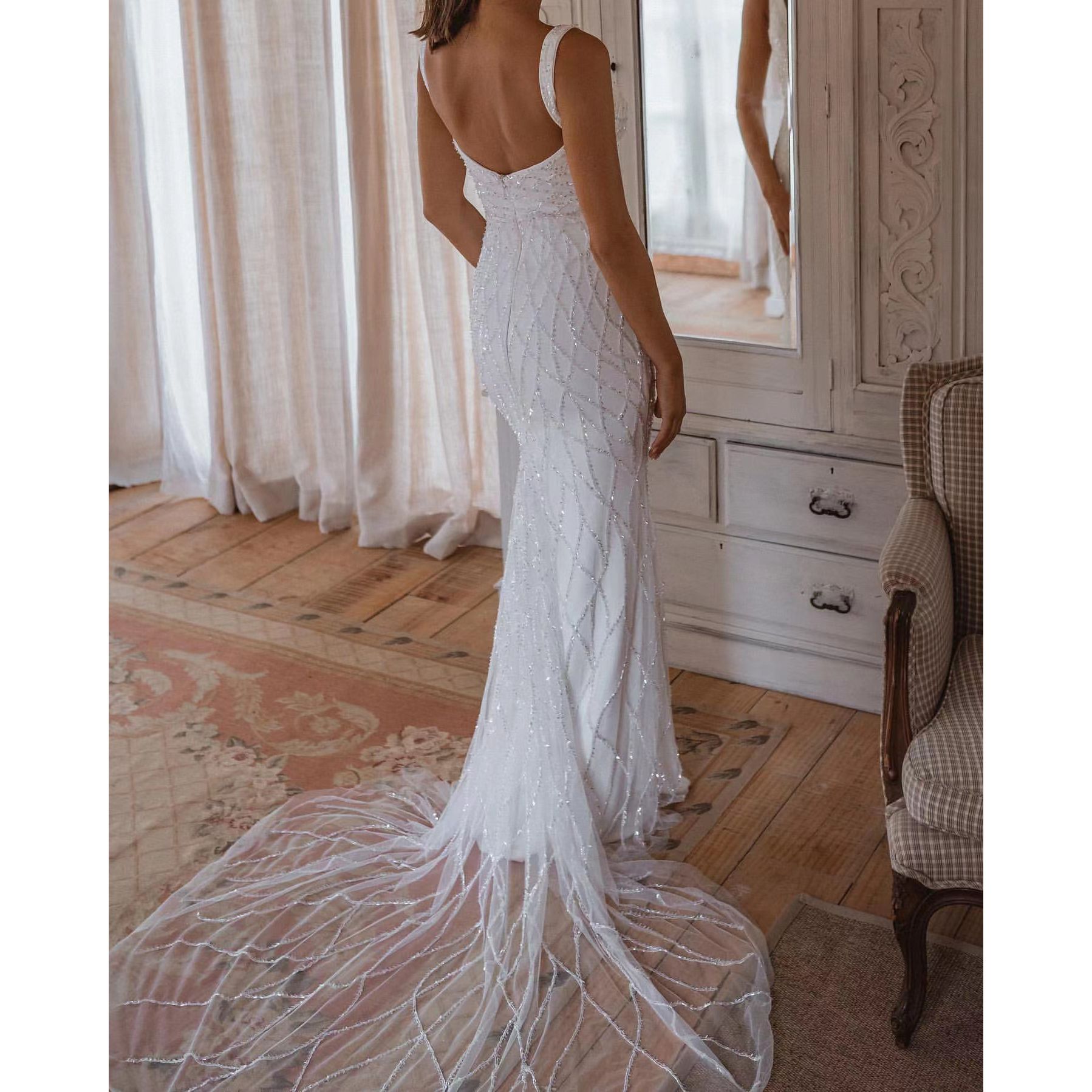White Sequined Mermaid Wedding Dress Beads Sleeveless Sparkly Bridal Dresses