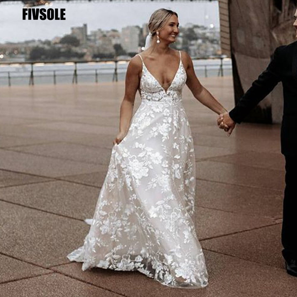 Exquisite Lace Applique Beach Wedding Dresses V Neck Sweep Train Elegant Bride Gowns