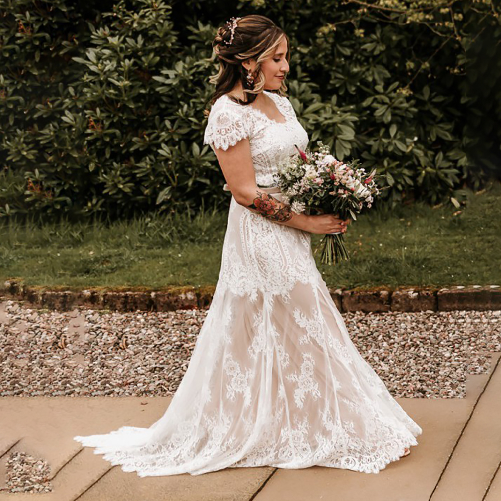 Boho Floral Lace Cap Sleeves Beach Wedding Dress Sash Custom Made A Line Romantic Buttons Rustic Garden Scoop Neck Bridal Gowns