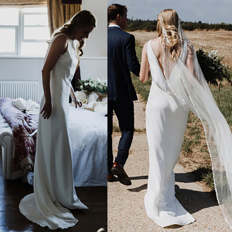 Column Satin Lace Mini Outdoor Wedding Dresses Custom Made Sleeveless Plus Size Bateau Simple Boat Neck Open Back Bridal Gowns