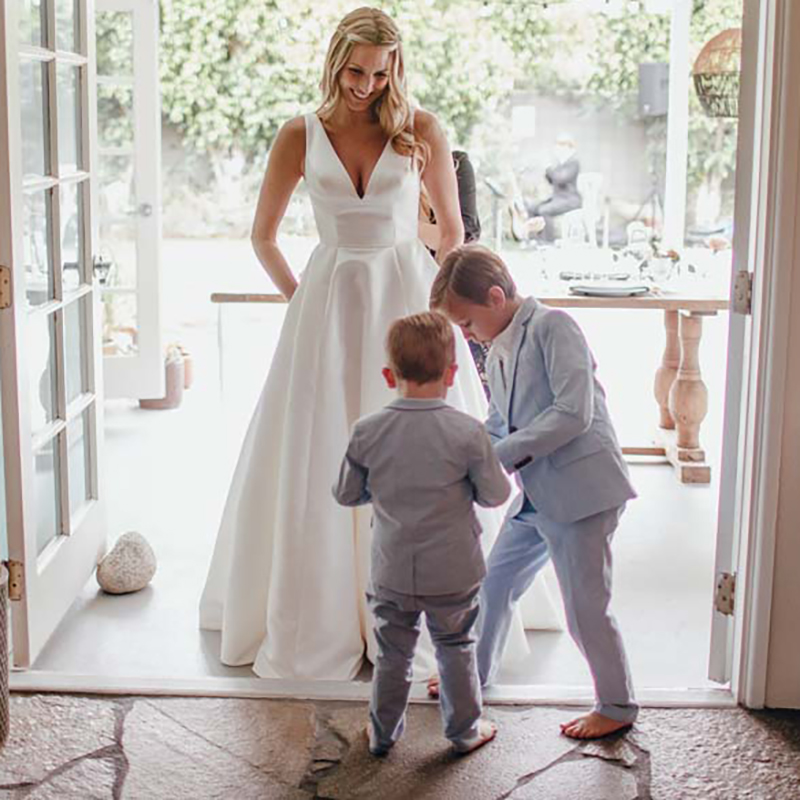Open Back Satin Backyard Wedding Gowns V-Neck Sleeveless Princess Simple Elegant Cheap Large Bow Custom Made Bridal Dresses