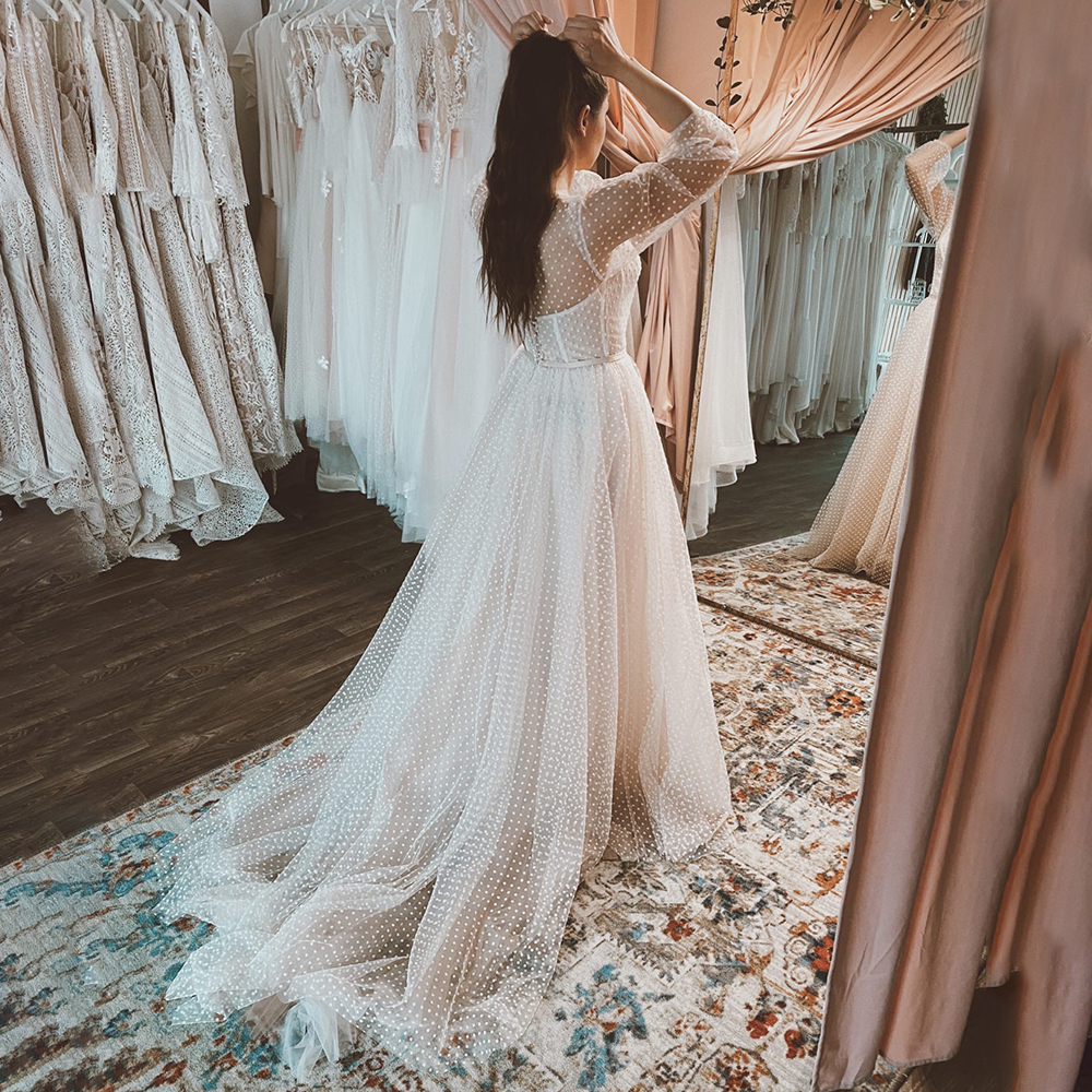 Polka Dots Plumeti Tulle Long Sleeves Wedding Gowns Drop Ship A Line Custom Made Boat Neck Illusion Back Lite Bridal Dress