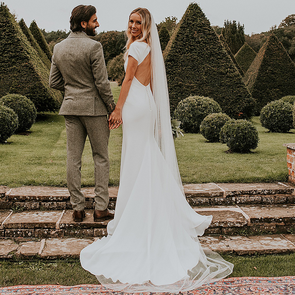 Round Neck Satin Simple Bridal Gowns Custom Made Plus Size Open Back Ivory Short Sleeves Mermaid Mini Wedding Photos Bride Dress